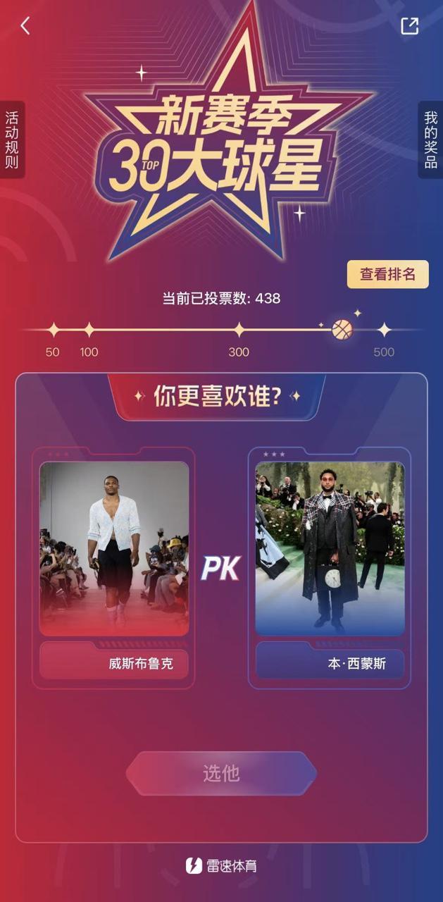 第一阶段的海选活动于10月14日14:00正式开启,广大老哥们可以从雷速编辑部根据用户搜索习惯以及喜爱程度选出的NBA球员大底池中进行两两PK,选出你心目中更喜爱的那个TA,根据两两PK的胜率得出最终的排名,排名前50的球星将会进入最终的投票阶段,第一阶段的海选将于明日17日的0点结束。
