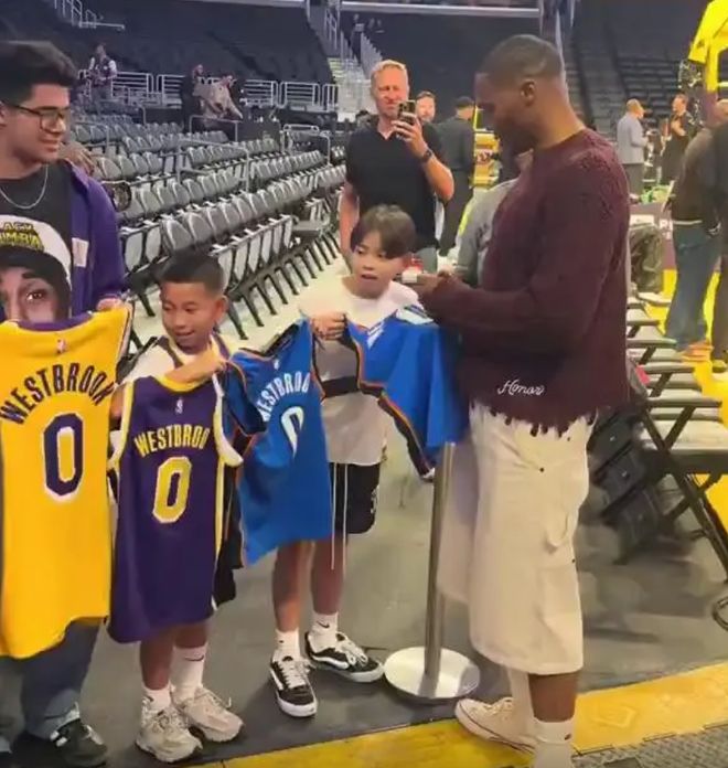 10月18日,国王VS湖人完成季前赛后,国王新援拉塞尔-威斯布鲁克在场边为球迷签名,雷霆球衣、火箭球衣、湖人球衣都有,少爷为球迷签名时唯独跳过了湖人球衣。这个举动引发了热议。