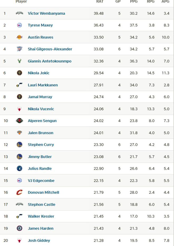 毫无疑问,榜首的位置属于文班亚马,休赛期解决血栓困扰,又经历少林寺闭关苦练后,文班亚马开季至今打出恐怖的统治级别表现。