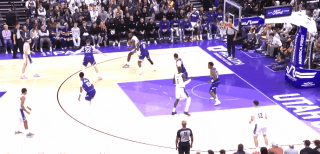 然后自己一个挡拆外切,扔了哈腾一个三分。